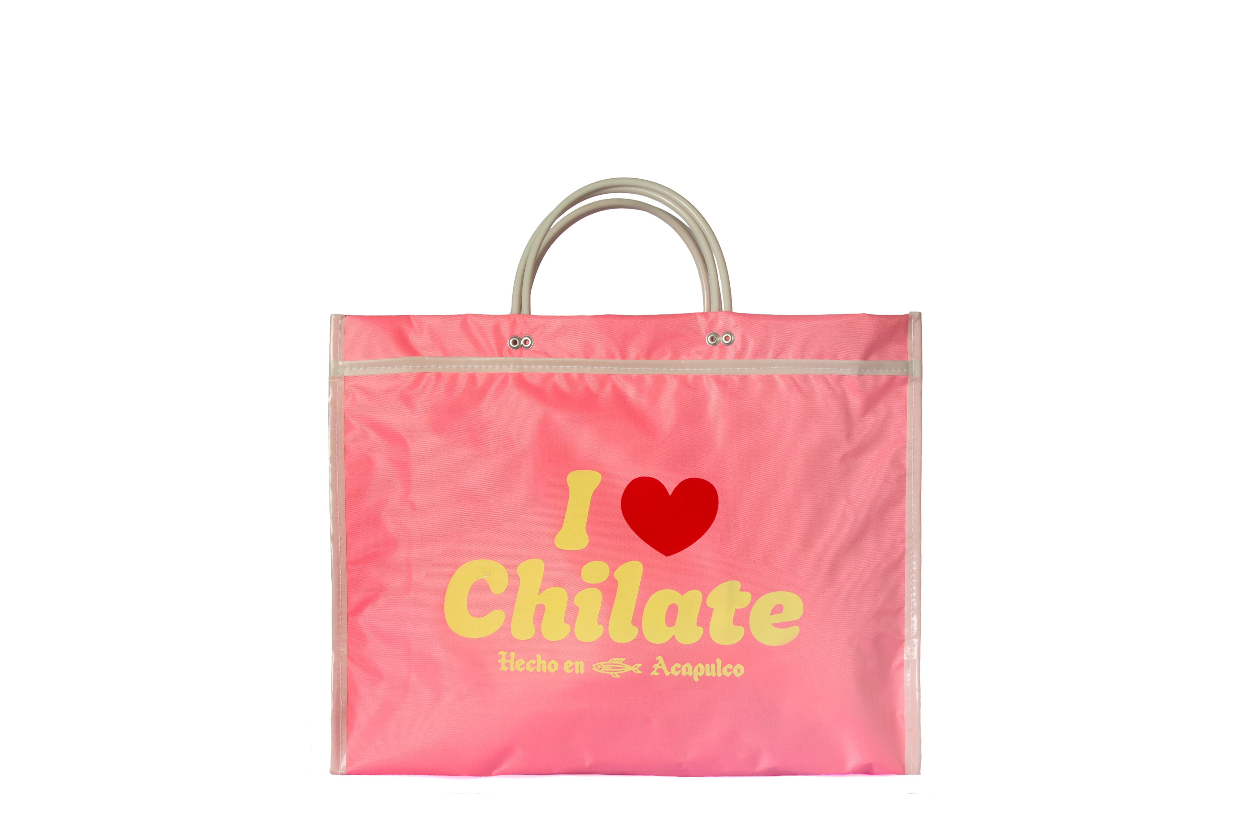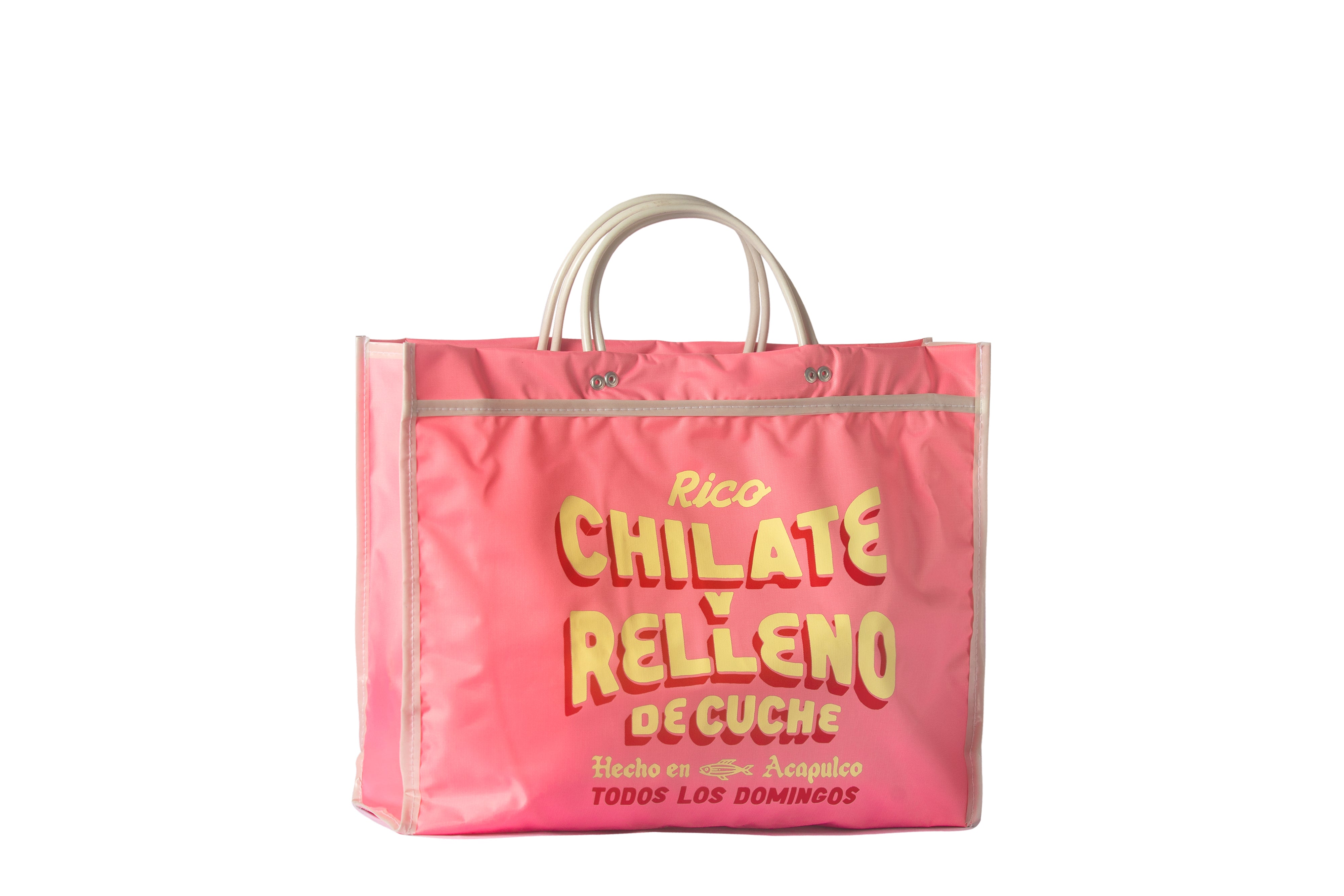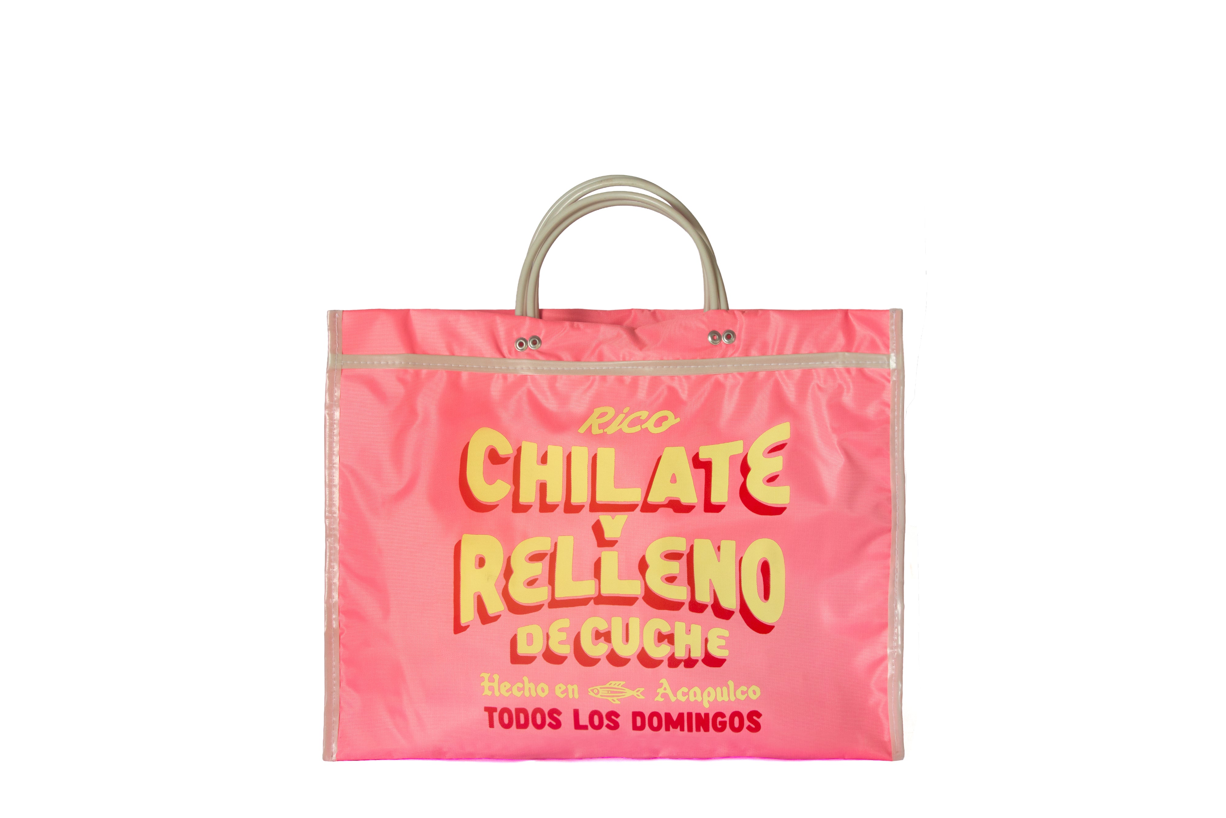 Bolsa de mercado en material plástico resistente, ideal para los mandados o para tus próximos outfits, inspirada en la gráfica mexicana de los rótulos tradicionales y en el icónico bolillo relleno con chilate.