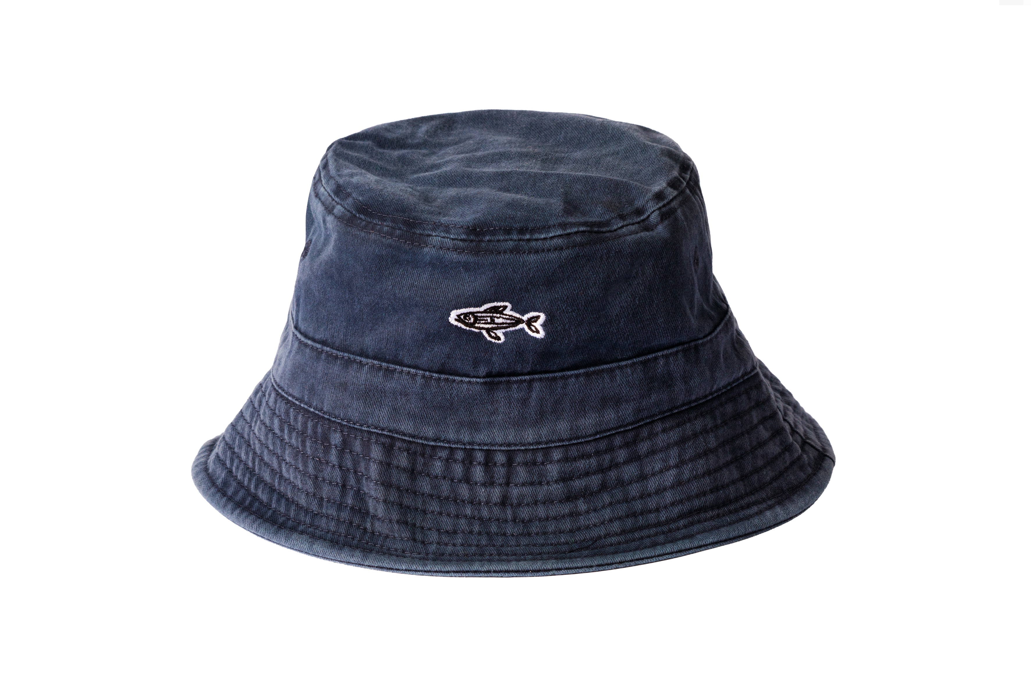 Gorra tipo bucket confeccionada en tela suave con acabado lavado en tono azul grisáceo, que le da un estilo relajado y moderno.