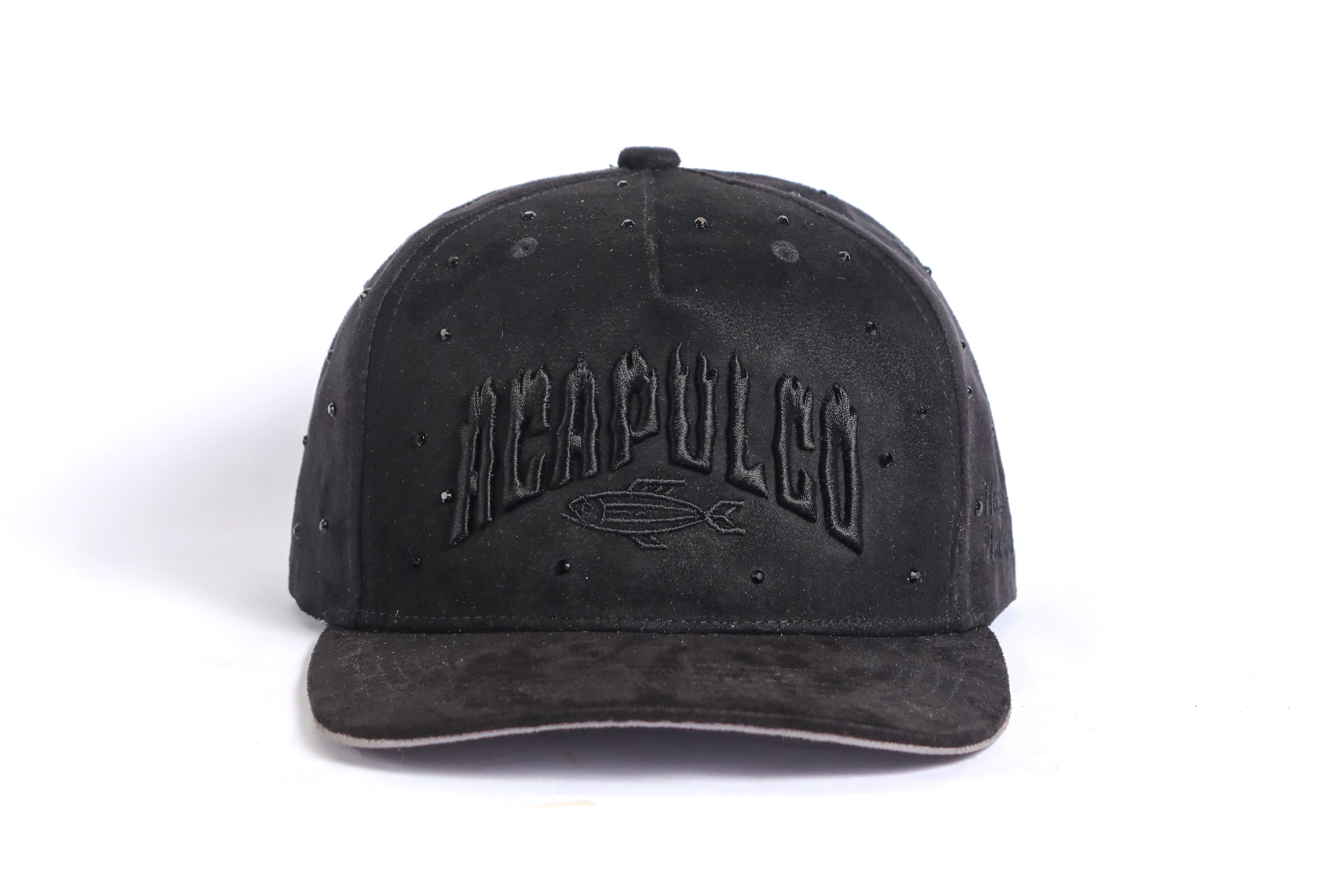 Gorra bélica confeccionada en gamuza de tacto suave color negro. Al frente luce la palabra “Acapulco” bordada en relieve, discreta y monocromática. Incluye elementos de pedrería incrustada, que suman actitud sin perder limpieza. Visera plana con canto claro y correa ajustable.