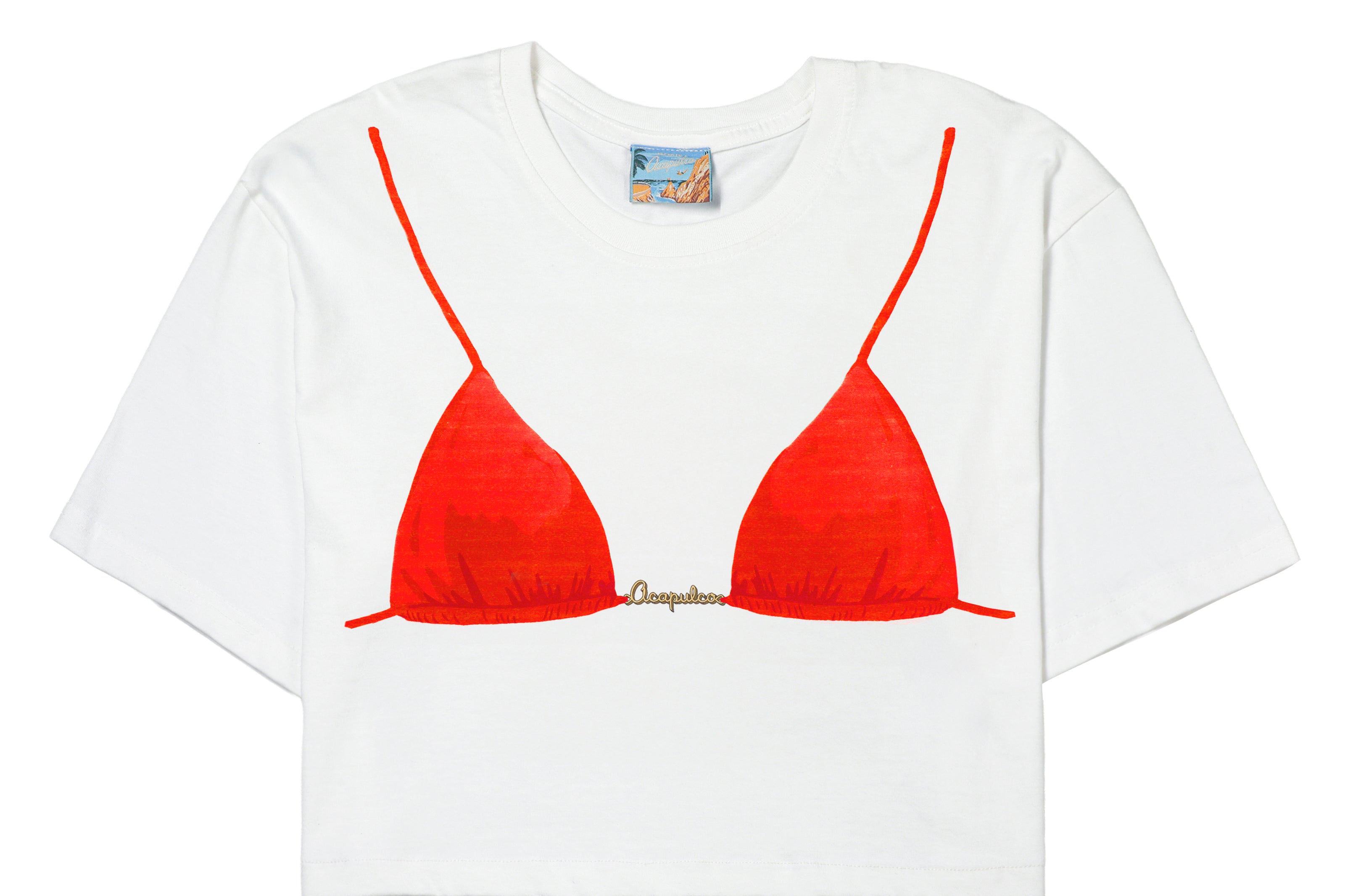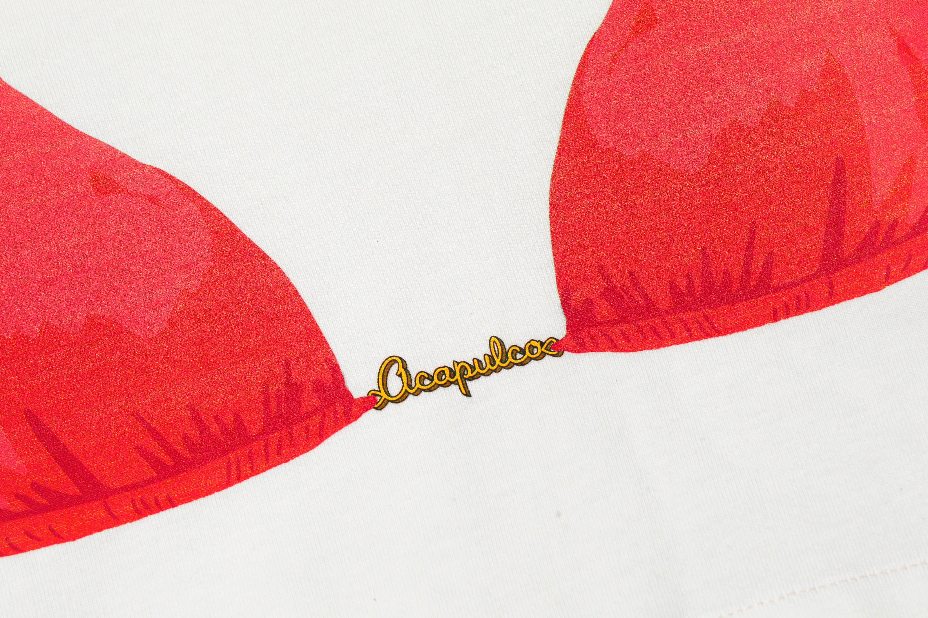 Con un estampado frontal de bikini en tono rojo, y un detalle tipográfico ‘Acapulco’ bajo el amarre del bikini.